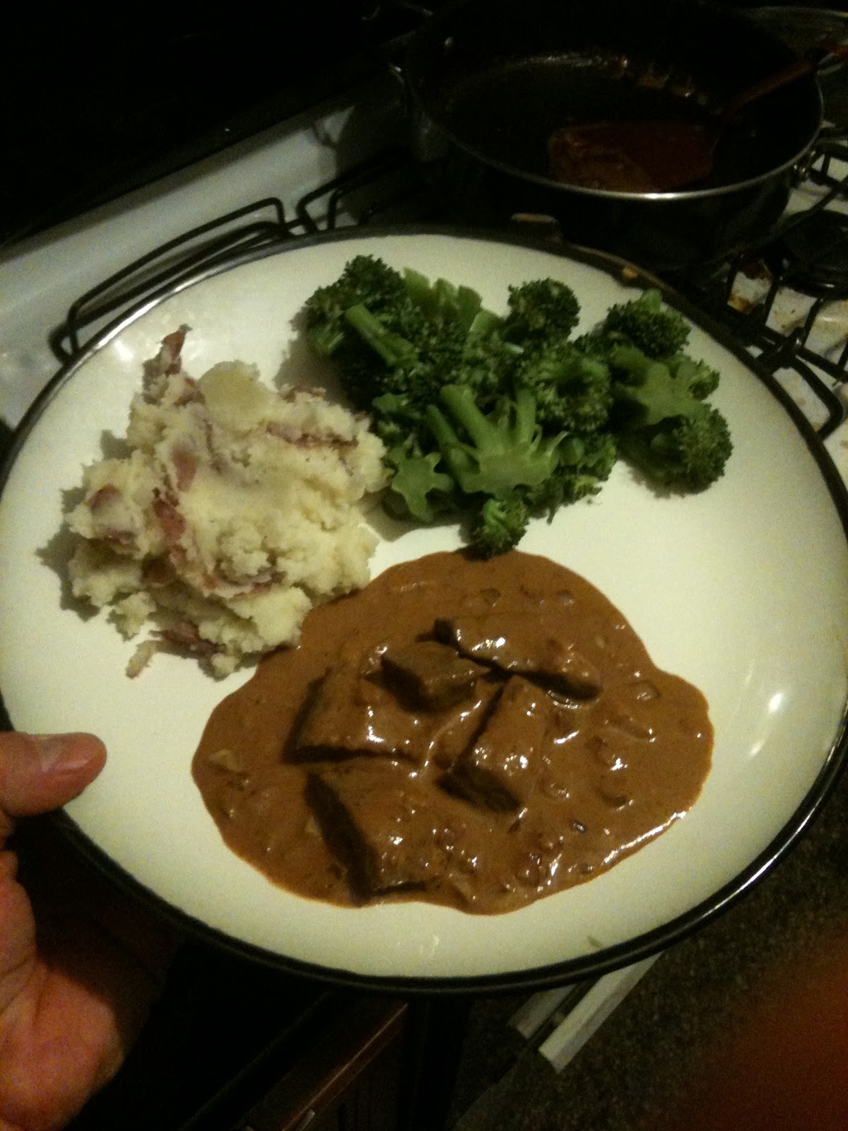 Instead of larger steak slices, I decided to cut the backstrap into bit-sized chunks and mix it in with the sauce. I served it with garlic and butter mashed red potatoes and some simple steamed broccoli (we like potatoes and broccoli, I'm sure you've seen those sides before in my posts). The sauce was beautiful, very rich and thick, going equally well with the potatoes as with the venison. This is definitely one of those simple recipes that turn out a delicious dish, I'd be happy to serve it in larger quantities at a dinner party.